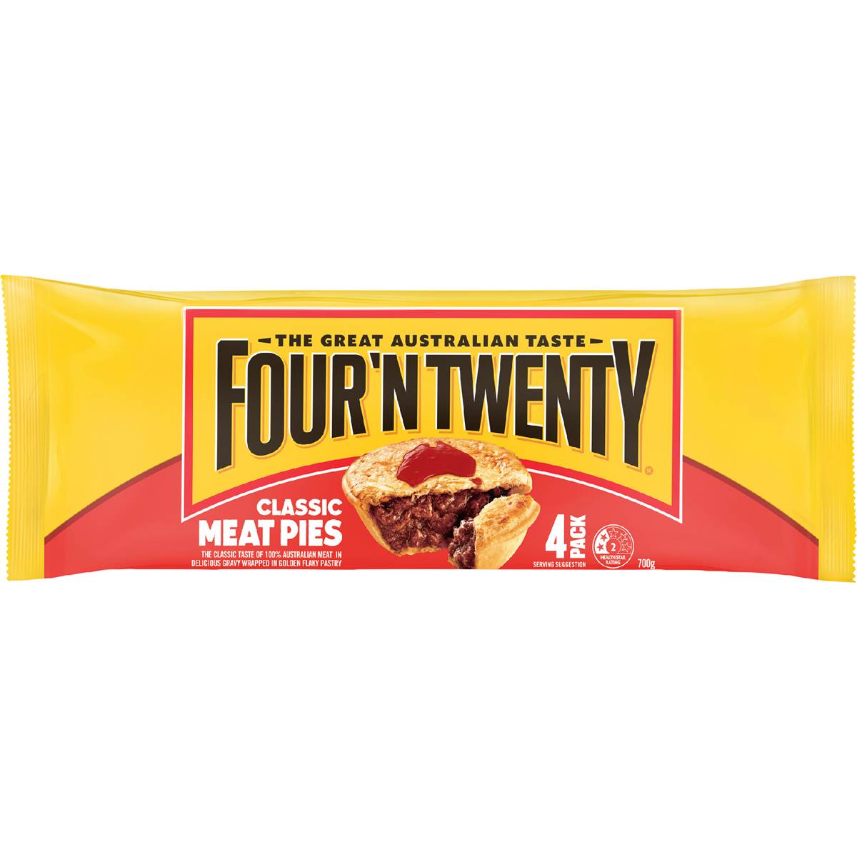 Ripping into a four'n'twenty meat pie from the servo is about as aussie as it gets and now vegetarians can enjoy the experience too. The unofficial four'n twenty (four and twenty) meat pie page. It is now one of the largest pie advertise with us. There are 431 calories in 1 pie (175 g) of four'n twenty classic meat pie. All of our pies incorporate traditional methods with an innovative list of ingredients, to create both sweet and savory hand pies.